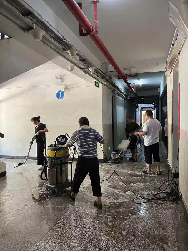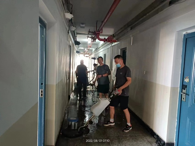 八月,持續的高溫不退,公寓管理員和保潔員師傅們頂著高溫,按照計劃分小組對樓棟走道和畢業生寢室的地面進行打磨清潔。其中,片長葉世波、景運武、保潔主管周霞發揮帶頭作用,協同管理員一起負責操作洗地機打磨地面,保潔員負責掃水拖地,在不透風的高溫高濕的樓棟走道,管理員和保潔員的衣服被汗水打濕了一遍又一遍。