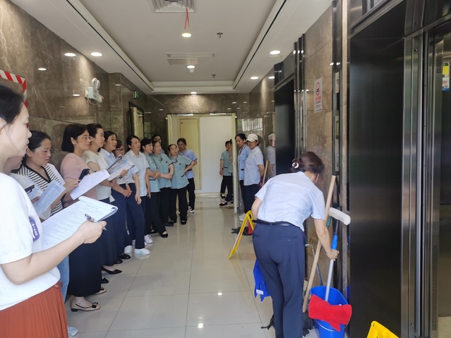 本次競(jìng)賽分為玻璃刮洗和電梯轎廂清潔保養(yǎng)兩項(xiàng)。玻璃刮洗項(xiàng)目共分16組,每組3人;電梯清潔保養(yǎng)項(xiàng)目共分23組,每組2名。各組參賽人員爭(zhēng)分奪秒,揮汗奮戰(zhàn),呈現(xiàn)出一幅你追我趕、熱火朝天的場(chǎng)景。評(píng)委根據(jù)比賽要求、操作步驟、清潔質(zhì)量等方面進(jìn)行綜合評(píng)分。經(jīng)過(guò)激烈角逐,評(píng)選出前八名,梁紅利榮獲第一名。