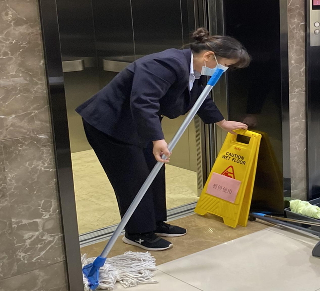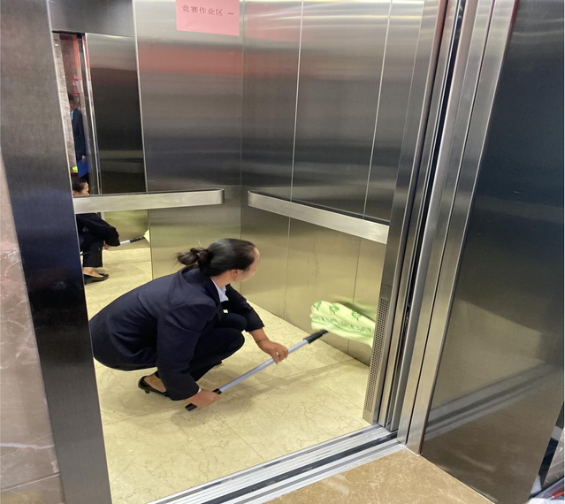 環(huán)境條線分為玻璃清潔及電梯轎廂清潔兩個項目,共計114名員工參賽,各賽段評委以公平、公正、公開原則,嚴格對照評分標準逐項點評打分,評分結(jié)束后,評審人員將評審單交給相關(guān)負責(zé)人進行統(tǒng)計。