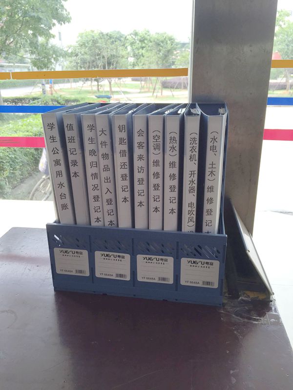 5月19日,公寓服務部行政管理人員分成兩組將此前購置的270個文件夾和27個文件架逐一擺放到每棟學生公寓,清理及規范值班桌上的物品擺放。此次工作得到了全體公寓管理員的積極配合,大家認真整理各類登記本,規范擺放辦公物品,公寓值班環境有了明顯的改觀。