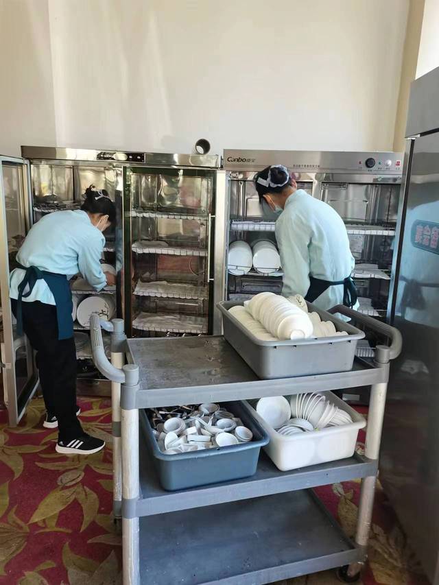 餐飲部組織員工對餐廳區域進行了徹底的衛生大掃除,對所有餐具統一高溫消毒,地面進行了反復推塵拖拭,營造溫馨舒適的就餐環境。