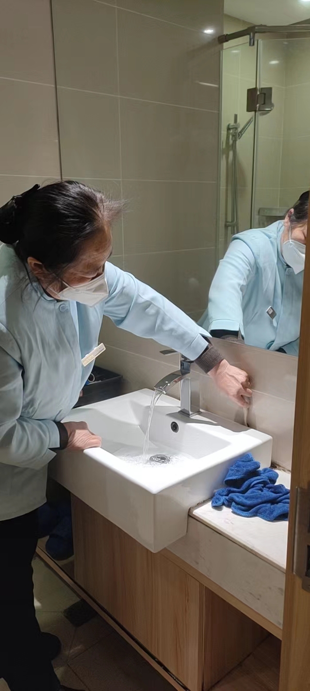 客房服務員根據主管安排,對所轄樓層每間房進行細致打掃,要求每間房地面一塵不染、床鋪橫平豎直、金屬锃亮發光。打掃完畢,客房主管一一查房,對不達標處要求即刻返工,力爭讓每一位入住客人從進入房間的第一秒就感受到賓至如歸的溫暖。