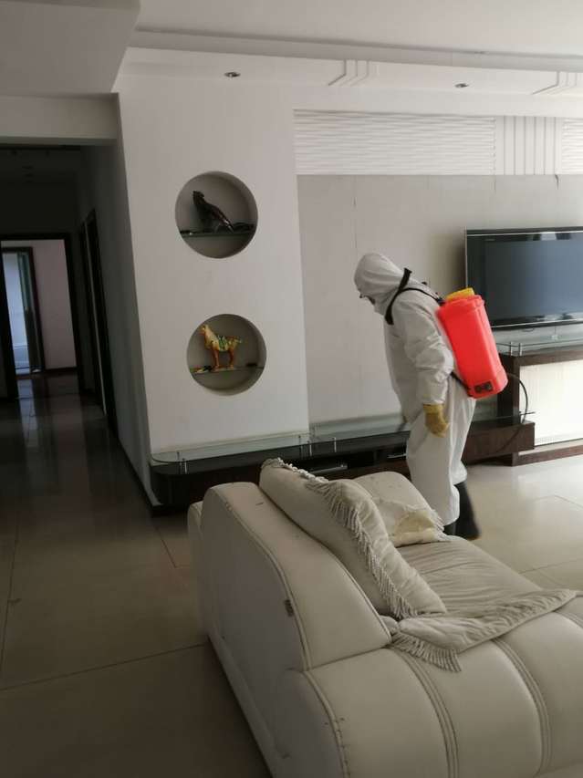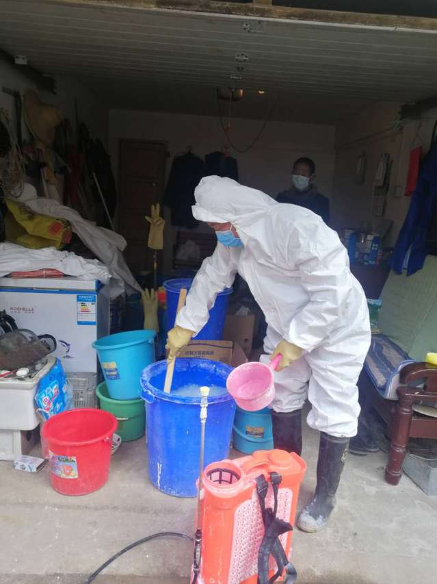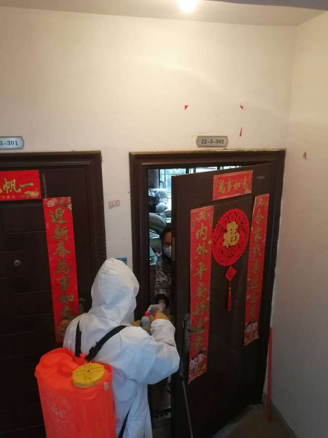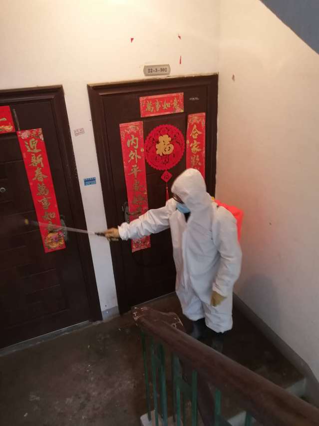 “這樣的一大桶水,要配上500g的漂白粉,攪拌均勻,如果要預防性消毒完整個區域,需要五大桶”。消毒隊長王定泳面帶微笑的邊說邊攪拌著。他從疫情防控初期連續在崗30天,從開始消殺知識的空白到現在的從容應對,藥物配置、消殺培訓、入戶消毒,他都親力親為。每天上午8點,王定詠、李廣早、吳德平、景運武四人背上約40斤消毒噴霧器,對小區公共區域、樓道、垃圾桶、電梯轎廂、進行消毒,連續工作七八個小時,從不叫苦叫累,由于長時間使用消毒劑,呼吸道受到了嚴重刺激,嗓子疼的水都無法下咽,可是他們心里明白,這是物業人的職責所在,仍然義無反顧沖在疫情防控第一線。整個消毒過程下來,這群平均年齡近60歲的人,個個后背汗濕、渾身酸痛,消毒隊員吳德平在消殺工作中因出汗太多導致感冒低燒,在家隔離14天無異常后又匆匆返回崗位。遇到小區有發熱病人時,他們也沒有退縮,進入住戶家中認真消毒完才離開,住戶要求自行消毒的就主動送物資上門,并積極宣傳消殺的各個環節。