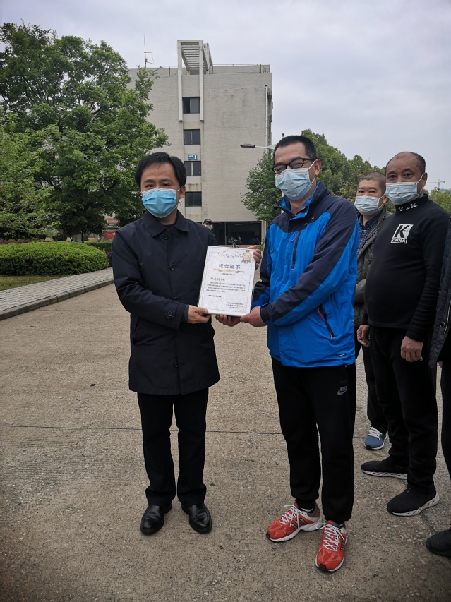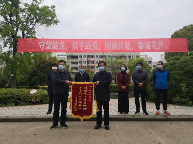 熊俊向?qū)W校贈(zèng)送錦旗。江岸區(qū)向?qū)W校捐贈(zèng)了價(jià)值37萬(wàn)余元的物資,董仕節(jié)向江岸區(qū)頒發(fā)捐贈(zèng)證書(shū)。熊俊與溫興生共同為醫(yī)護(hù)人員頒發(fā)紀(jì)念證書(shū)。