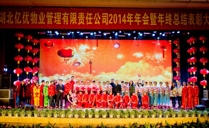 在充滿愛國情懷與正能量的《祝福祖國》舞蹈中,年會拉開了序幕。副校長吳顯富首先致辭,他向三百多個日夜堅守在一線的保安、保潔、維修、公寓管理員表達了新春的問候,對公司2014年工作給予了充分肯定,認為公司2014年經(jīng)營目標的超額完成是全體員工努力奮斗的結(jié)果,希望來年公司上下齊心,再創(chuàng)佳績。總經(jīng)理楊守平回顧了2014年公司經(jīng)營、管理、服務等方面工作,肯定了億優(yōu)人“真心服務、誠心奉獻”的精神風采、“開拓進取、努力創(chuàng)新”的職業(yè)追求、“精細管理、追求卓越”的價值取向,他要求所有億優(yōu)人一如既往地保持大局意識、憂患意識、責任意識,在學校第三次黨代會提出的“增強保障能力、改善服務質(zhì)量、提升服務品質(zhì)”精神引導下,以昂揚的斗志和改革的勇氣,釋放正能量,做好億優(yōu)人,辦好億優(yōu)事。