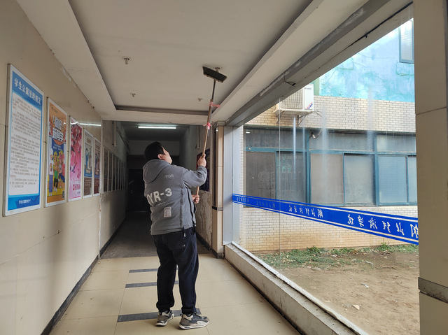 各樓棟公寓管理員有序清理樓棟蜘蛛網、手扶梯、沖洗樓棟臺階,檢查寢室水電、門窗、加強日常巡查,規范學生公寓門口非機動車輛停放,用心用情守護樓棟,有效保障了假期間學生公寓的安全與清潔。