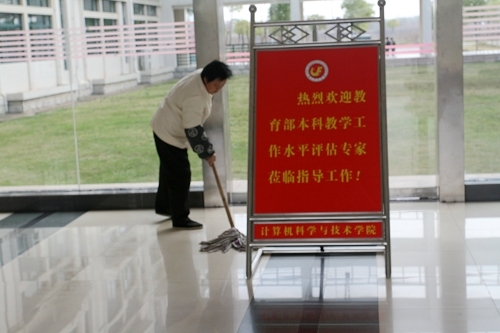 本網訊(通訊員 周錦華攝影報道)2007年11月19日,在晴暖的冬日里,教育部專家組在學校領導的陪同下,考察了我校的圖書館、實驗樓、體育館、實訓中心等設施,億優公司廣大員工以飽滿的精神狀態,兢兢業業,堅守各自的崗位,默默地為本科教學評估工作營造整潔有序的學校環境,用實際行動迎接專家們對學校工作的檢查、指導。