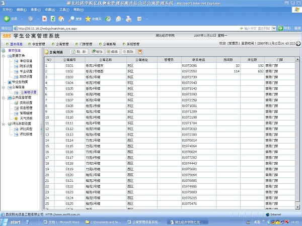 公寓管理信息系統的安裝,方便公寓管理人員對學生公寓的樓棟、寢室房間號、床位、空床位、及每個學生的姓名、性別、院系、專業、班級、學號、聯系電話等信息進行詳細的記錄;還可進行日常零星的入住、調換、退宿等信息的及時更改;老師、學生、學生家長可隨時隨地通過網絡查看信息,對學生公寓的各項工作提出自己的意見和建議,公司能及時發現學生公寓管理工作中問題和不足進行整改;同時能加強公司與學生、學生家長的溝通、交流力度,將進一步提高管理效率,減輕工作負擔,降低服務成本,提升公寓科學化管理水平。