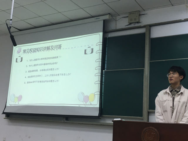 會議首先介紹了權益部學院組、維權組、宣傳組工作流程及工作內容,幫助學生了解維權途徑,引導學生掌握正確的維權方法。現場對學生生活中常見的問題進行著重講解,最后通過現場問答、權益知識搶答環節加強了學生對權益知識的了解,活躍了現場氣氛。