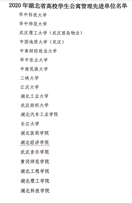 本網訊(通訊員 汪子欣)2020年12月7日,湖北省高等學校后勤研究會印發了“關于表彰2020年湖北省高校學生公寓管理先進單位和先進個人的決定”。我校榮獲“湖北省高校學生公寓管理先進單位”榮譽,桔九管理員易以平、桔五管理員諶紅連以及桂一管理員溫國慶榮獲“湖北省高校學生公寓管理先進個人”榮譽。
