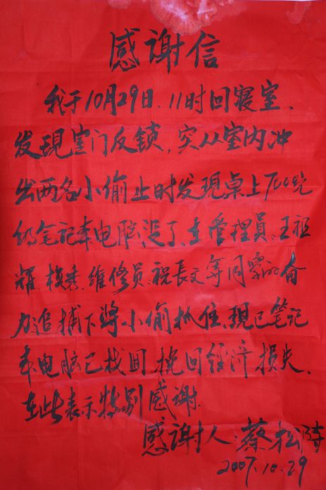 據(jù)了解,正值中午學(xué)生下課時間,維修工在維修完竹3-107寢室的鐵床走到走廊時,聽見后面一位學(xué)生說:“我的電腦不見了”。祝長文立即警覺起來,走到門廳時,看見一個身穿黑色休閑裝的男子神情緊張地從樓梯急沖沖地走下來,祝長文頓時覺得可疑,當(dāng)此人走出大門向左拐時突然跑起來,祝長文便沖了出去邊跑邊喊:“抓小偷”,隨后公寓管理員王祖耀也跟著追出了學(xué)生公寓,在追到九華廳時,路邊的學(xué)生聞聲后立即將小偷堵住,祝長文將小偷扭送到保衛(wèi)處,該小偷對偷盜電腦一事供認(rèn)不諱,目前該案件正在進一步審理中。對此,提醒廣大同學(xué)保管好自己的財物,防止不法分子乘虛而入。