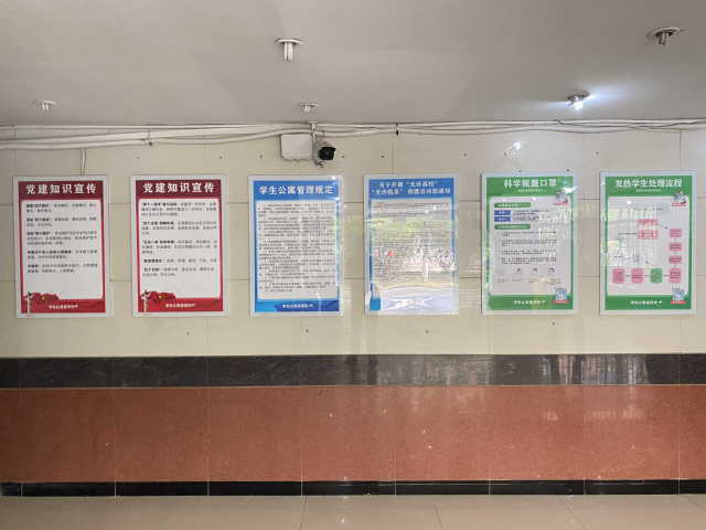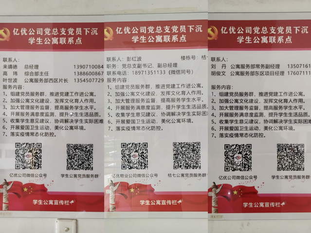 一方面,公寓服務(wù)部在各樓棟內(nèi)設(shè)置文化宣傳欄,充分利用宣傳欄,載入新形勢新政策,提醒學生關(guān)注時事。首先在學生公寓桔七西做試點,得到學生的認可;其次,試點成效顯著,將文化宣傳欄在學生公寓內(nèi)全方位覆蓋,先后對東西區(qū)進行安裝。另一方面,將黨建融入到學生公寓中,黨員下沉至樓棟、建立黨員聯(lián)系點、設(shè)立黨建內(nèi)容的海報專欄。通過專項宣傳,在學生公寓形成濃厚的黨建學風。