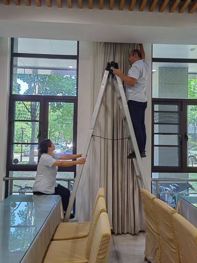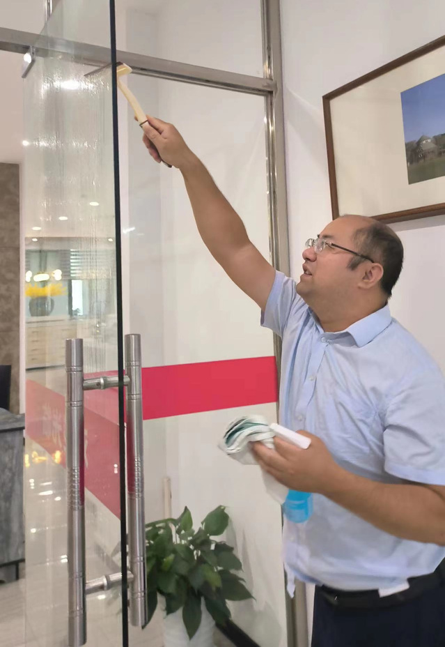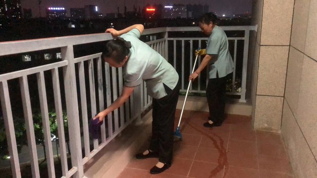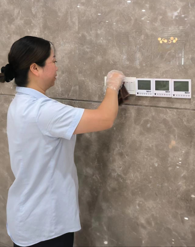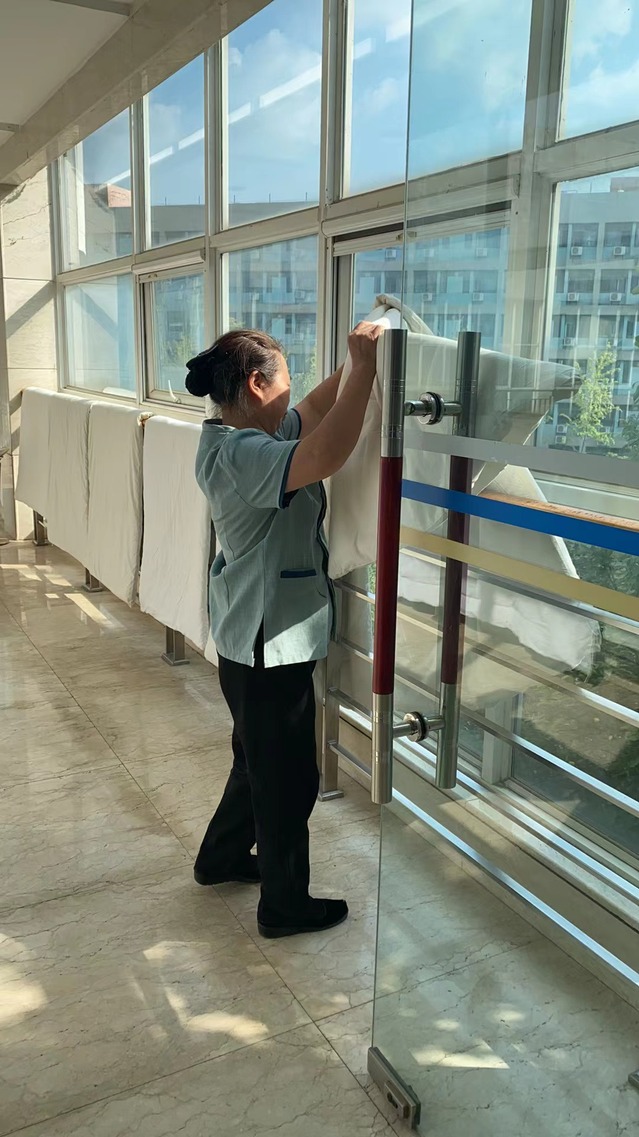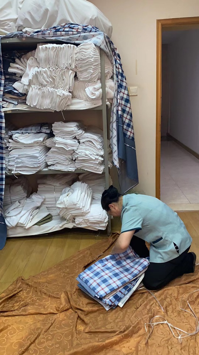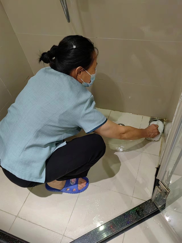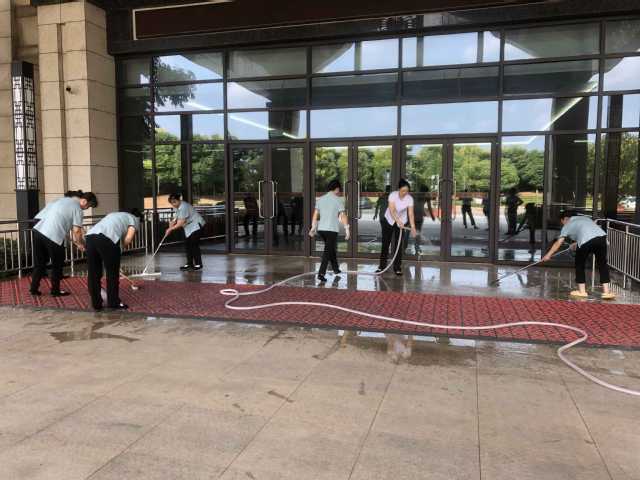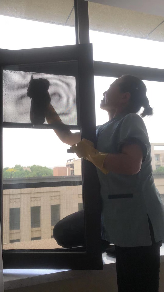 客房部合理安排客房服務員和公區服務員按樓層、區域完成計劃衛生工作。房間里,每位客房服務員均嚴格按照要求進行窗戶擦洗、紗窗除塵、墻面洗刷、地漏清洗除銹、淋浴門刮洗、布草清點、被芯晾曬等工作。公共區域,PA服務員對地面、地墊進行沖刷清洗,對所有玻璃進行清潔,對衛生間五金件進行除銹、打蠟,事無巨細,力求做到每個細節無遺漏。同時,對國際學術交流中心頂樓雜草進行了清理,并對客房進行了徹底消殺和衛生清潔。