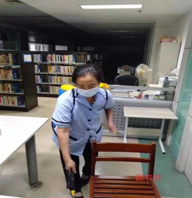 巾幗不讓須眉,戰疫聲聲傳捷報。保潔員沖鋒在前,干勁沖天,個頭雖小,每天清掃各樓層及書架上的灰塵,保質保量完成整個圖書館的環境衛生的清理工作,以及日常消殺工作,從不叫苦叫累。從細微處入手,不放過任何衛生消毒偏角。