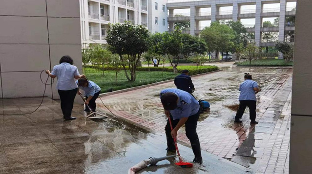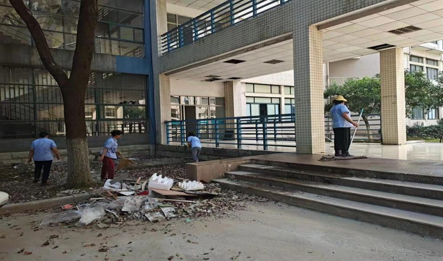為保障我校師生干凈整潔的學習和生活環境,教學教輔區保潔員對中庭花園、臺階等地面進行沖刷、清洗,對天臺雜草、排水溝、扶手、臺階、衛生間等全方位清理、消殺。汀蘭苑、市內家屬區保潔員對樓道雜物、天花板蛛網、綠化帶白色垃圾等衛生死角進行徹底清理。