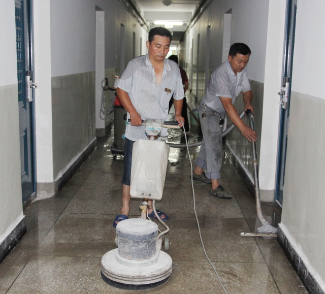 在學校北大門口,公司三名接待人員頭頂烈日,依然堅持在工作崗位上,為前來報道的選調生提供咨詢服務;在國際學術交流中心,三名身穿藍白條紋上衣的工作人員,正在為現場來報到的選調生工作人員及輔導員辦理入住接待手續;在大學生活動中心,公司安排專人為選調生發放文化衫、文具、工作牌、培訓資料、校園卡(門禁卡)等,現場銜接各項事宜;在學生公寓大廳,公寓管理員正在為選調生辦理入住登記手續,發放《溫馨提示》;在竹一、二棟學生公寓走道,物業服務部派出30余名保潔人員正在對裝修后的公寓走道清洗,有的用洗地機清洗、有的用拖把拖,有的正在用水沖,現場一片忙綠的景象,盡管汗水濕透了衣背,大家仍在堅持工作。穿梭在東區櫟苑、桔苑、西區竹苑之間的還有維修人員,卡式門鎖、熱水、空調、售貨機等生活服務后勤保障人員,大家不畏高溫、不懼辛苦,只為給選調生提供舒適的生活服務。