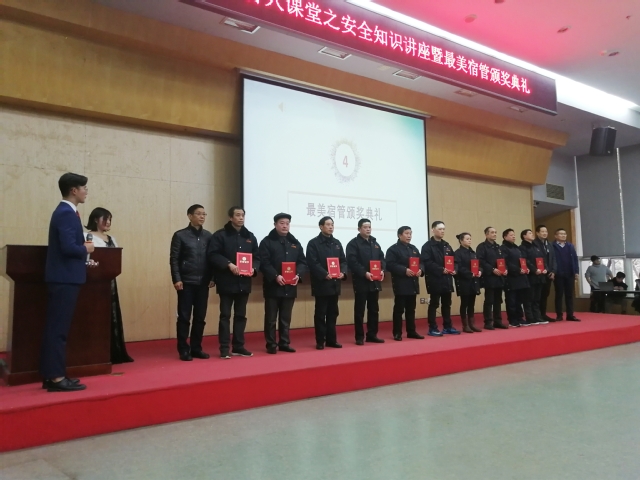 本網訊(通訊員 劉丹)學生公寓是學校育人的第二課堂,對學生的成長成才起著舉足輕重的作用。為提高學生公寓管理服務水平,推進平安校園建設,12月14日下午,億優(yōu)物業(yè)公司、共青團湖北經濟學院委員會、法商學院聯合舉辦的“第二育人課堂之安全知識講座暨最美宿管頒獎典禮”在學術交流中心二號報告廳舉行。湖北經濟學院團委副書記車純賢、法商學院黨委副書記楊宏斌、學工部部長呂學斌、億優(yōu)公司總經理來靖德、黨總支書記王水斌、副總經理陳武等出席了本次活動。