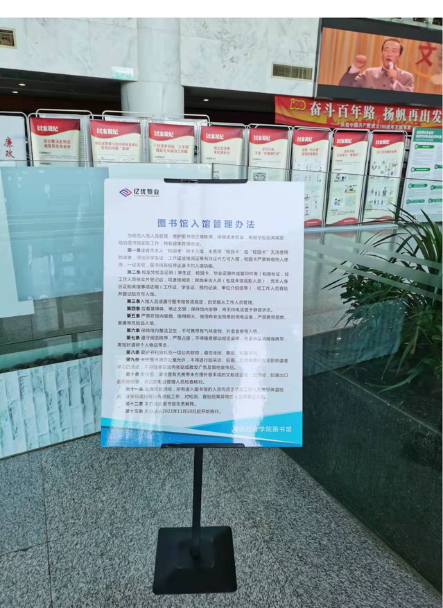 為嚴格把控出入館人員,減少日常入館的各種矛盾,物業服務部與圖書館保持溝通,完善《圖書館入館管理辦法》,并在閘閥上張貼《湖北經濟學院圖書館入館須知》,同時制作了“一人一卡、憑卡入館”等醒目提示。并更換了出入口登記桌椅,建立出入登記臺賬,對未持卡人員嚴格問詢及登記,為圖書館師生人身及財產安全樹立一道安全屏障。