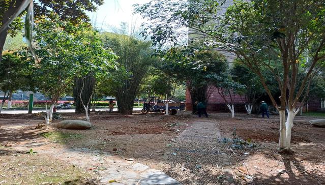 汀蘭苑29-30棟之間原有16叢窩竹,長勢過旺,住戶反映影響影響采光,滋生蟲害。為此,物業(yè)服務部進行了民意調(diào)查,依據(jù)調(diào)查結(jié)果,于3月28日組織實施對其中8叢窩竹拔除的工作,并對余下8叢進行修剪,拔除后光線通透、敞亮,提高了相鄰樓棟的通風和采光,獲得教職工的一致好評。