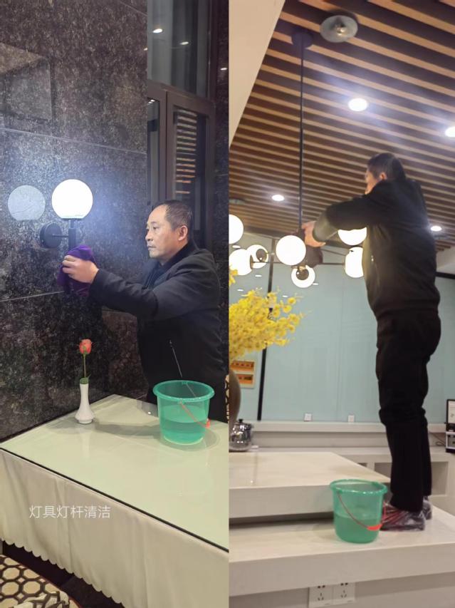 餐飲部在繼續(xù)做好盒飯供應工作的同時,按計劃進行區(qū)域內外玻璃刮洗,桌面、地面以及消毒柜、冷藏柜的徹底清潔,餐具、廚具的消毒,燈具燈桿的抹塵,各項工作均有條不紊進行。除此之外,還用沙發(fā)布藝清洗機高溫清洗了二號自助餐廳120張布椅,清理了一號自助餐廳110張餐椅腳,確保餐廳區(qū)域內各處都窗明幾凈、一塵不染。