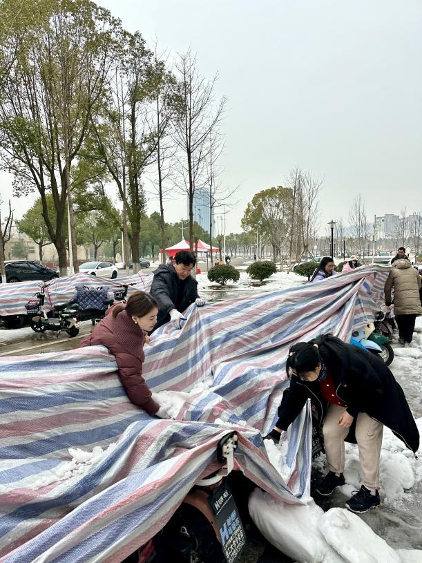由于寒假期間天氣惡劣,遮雨布上覆蓋一層厚厚的霰,增加了本次志愿服務活動的難度。活動伊始,全體黨員緊密配合,一組黨員手持剪刀,將遮雨布與非機動車繩索固定處剪斷,另一組黨員緊跟其上,將遮雨布上的霰清理下來,隨后合作將遮雨布整齊疊好,雖然天寒地凍,大家干勁十足,工作熱情絲毫不打折扣。