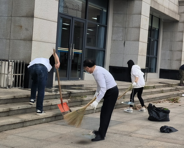 最后,全體黨員到汀蘭苑小區高層外核酸檢測點廣場開展了主題黨日實踐活動。黨員們分工協作,有的拿鐵鍬除草、鏟垃圾,有的用鋸子伐樹,有的清掃地面,有的清理雜物,有的收集垃圾......熱火朝天,干勁十足。經過近1小時清理,核酸檢測點廣場環境大變樣,更加干凈、整潔、空曠了,現場做核酸的居民紛紛點贊,還有汀蘭苑小區居民駐足與黨員們交流,表達感激之情,表示也想參與類似志愿服務。